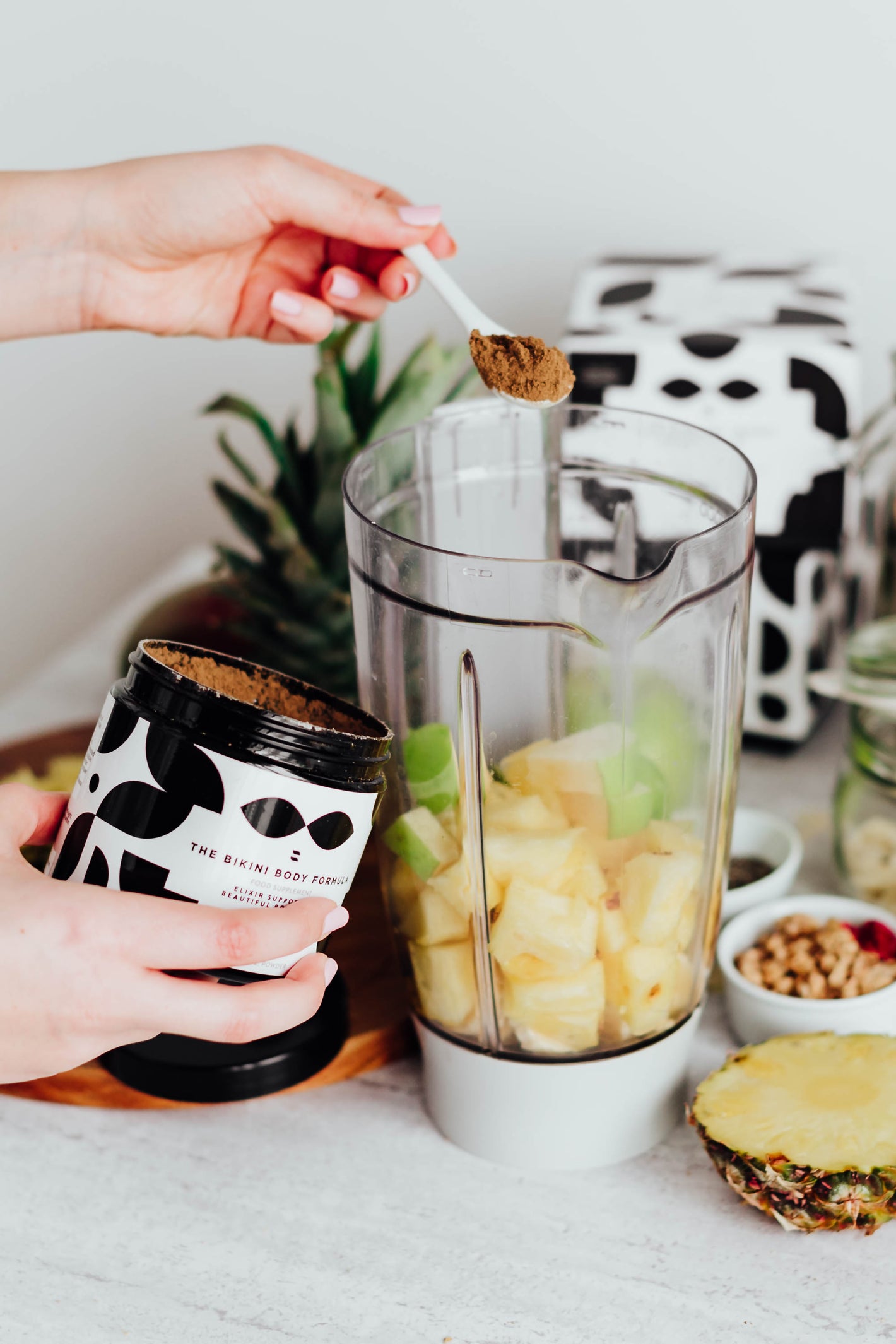 Zmieszaj 5 g The Bikini Body Formula ze szklanką mleka, soku lub koktajlu owocowego lub warzywnego, raz dziennie.